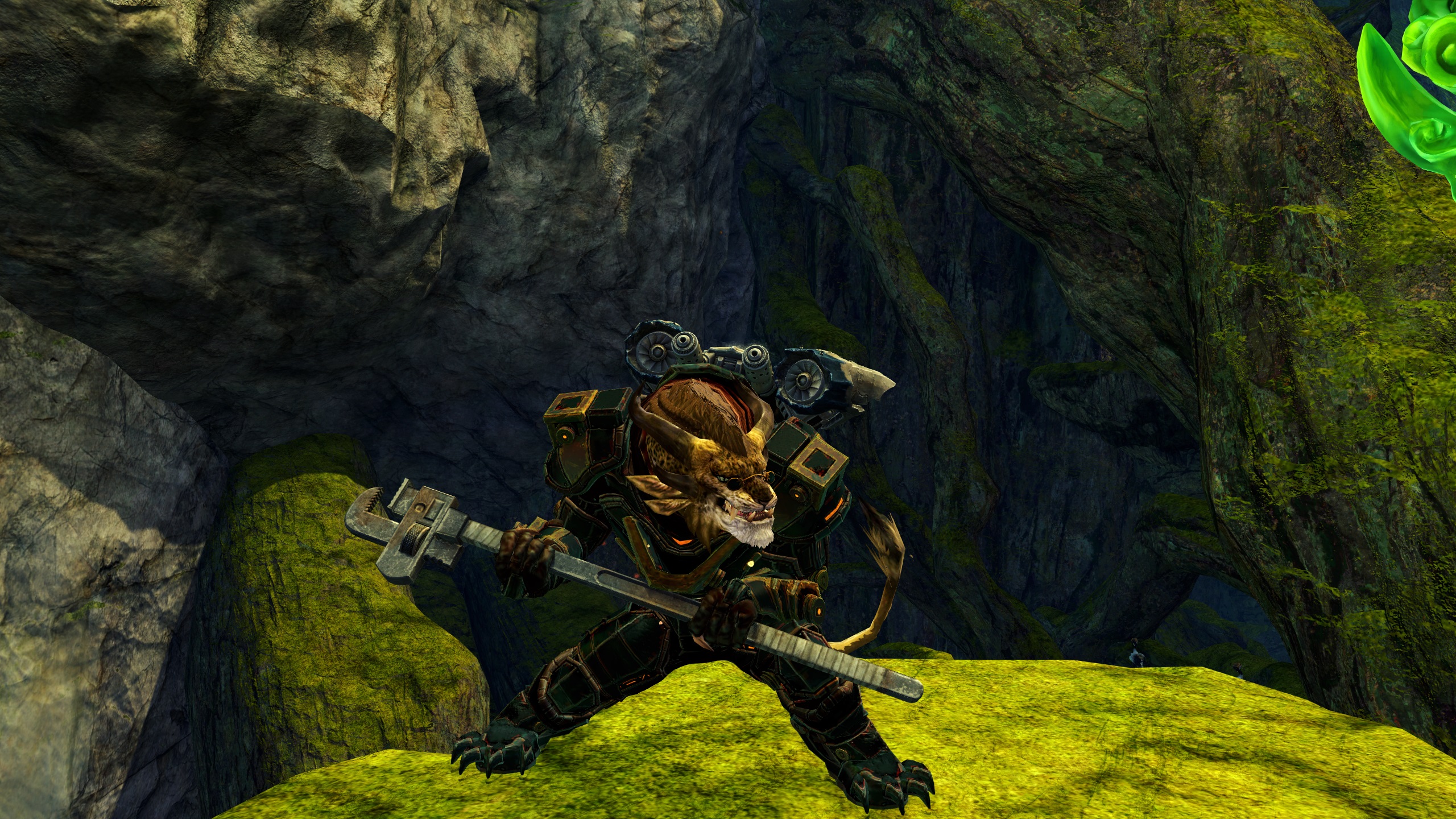 Her new understanding also allowed her to reconfigure her armor's steam-ley enhancements with jade-powered superchargers, increasing her natural strength and aim sevenfold. Her experiments with jetpacks proved unsatisfactory however, and she eventually returned to her old reliable assault glider design, which with her new enhancers proved much less unwieldly to carry around. After all that time she spent in Maguuma Jungle during the campaign against Morderemoth, it felt safer to have it than not.