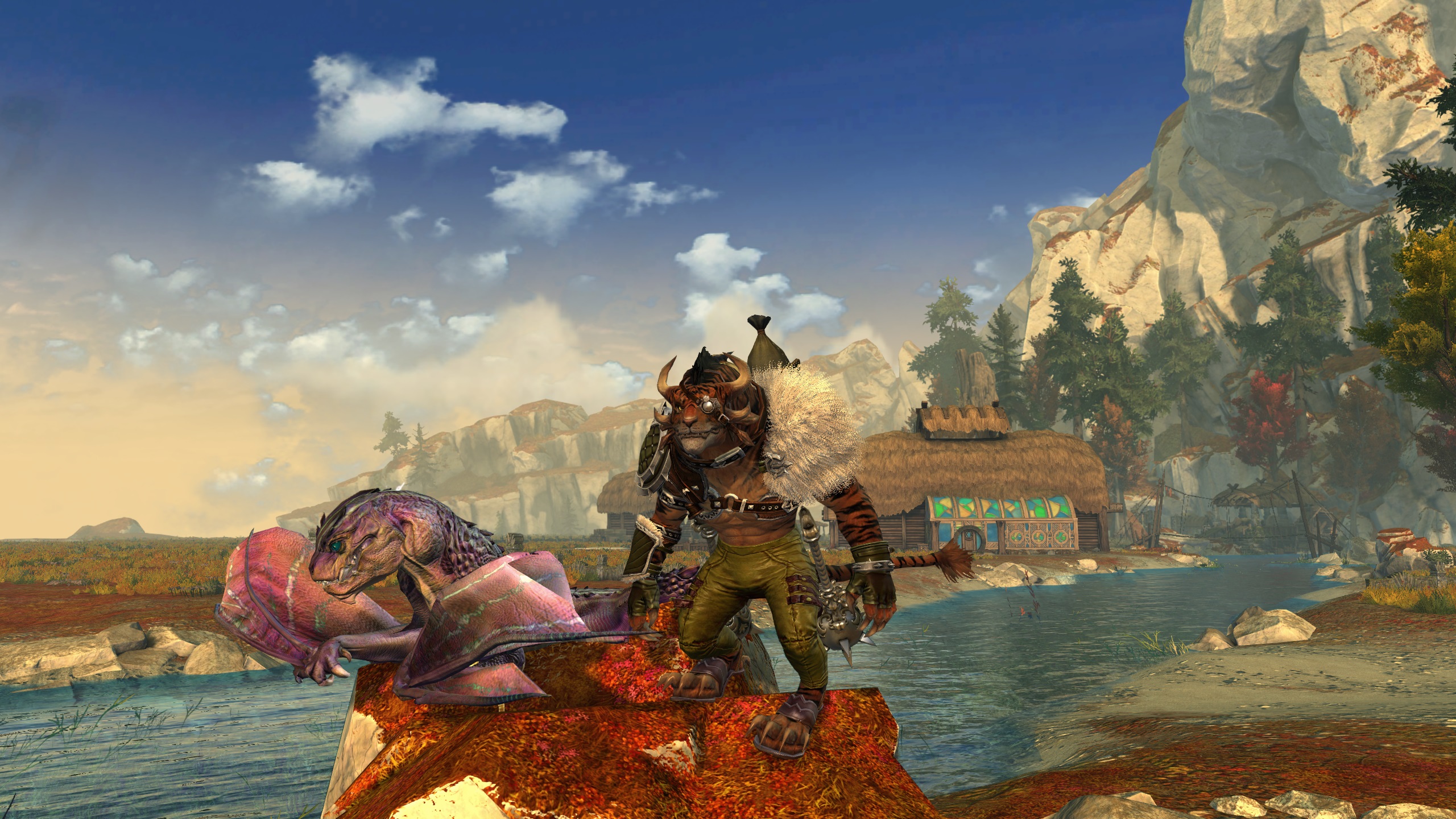 The charr are a feline race native to the land of Tyria, who live in a militaristic society. They are nominally split into four Legions, the Blood, Ash, Iron, and Flame legions, each with their own specialty. You can find more information about Charr at the GW2 Wiki.