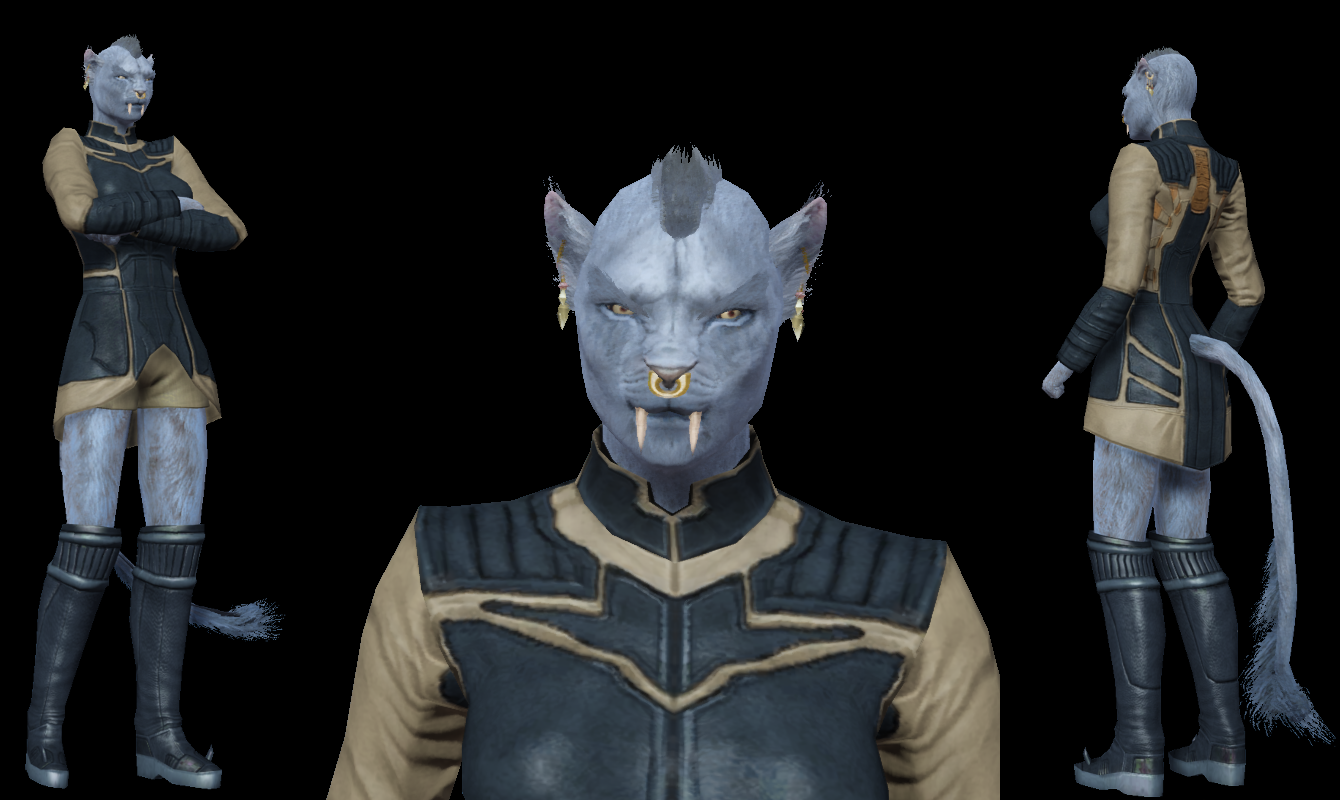 Zahara is the official head armsman for, and personal bodyguard to, K'tara for the past ten years. When K'tara moved to her new command, Zahara took over as head of security, as she wouldn't trust anyone else with it. She has a strong preference for melee weapons, preferring to beat her opponents up close and personal. She has attracted the attention of quite a few males of several species, but she has repeatedly stated she would only consider someone worthy to be worthy of attention if they can best her in an unarmed wrestling match. In her entire career thus far none have been capable of this, despite it being a weekly thing among the marines to try. At this point, she's honestly not sure what she would do if someone finally did.
